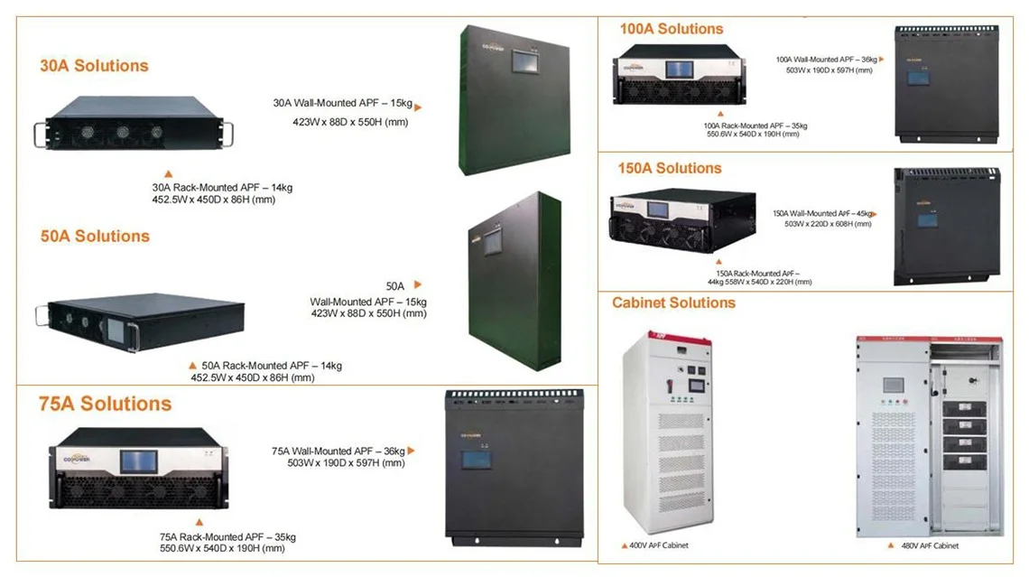 wall-mounted series Active harmonic filters(AHF for short ) is a more flexible installation with excellent compact modular design, The Maximum size for the single module is 150A, and it also can be connected in parallel as a floor stand cabinet solution. Hanging on the wall saves much space and also offers good convenience to space-limited installation sites. CoEpower Active harmonic filter is based on IGBT-based inverter functions of dynamic harmonic compensation (varying amplitude and frequency) and reactive power compensation (leading or lagging). This AHF works by injecting in a current of the same magnitude but opposite in phase in the distorted electric power system to offset the harmonic, thus reaching a THDI of less than 5%, The advanced NPC 3-level topology design, and DSP+FFT high-speed operational capability supports a stable ultrafast working performance without overload.